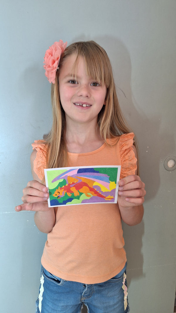 Es una actividad creativa que consiste en láminas con dibujos pre-cortados y adhesivos. Los niños despegan las secciones una a una y vierten arena de colores para crear cuadros con relieve y textura.